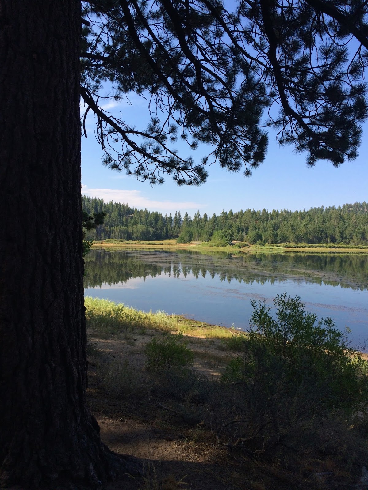 So, with that in mind, the Sagehen Creek trail was almost perfect except it didn't have much uphill climbing. It was a serene walk in the park. The trail was mostly narrow, single file even, nicely shaded and scenic. Only one part comes to mind that could have been a negative. A clearing of dry grass looking a bit like the Serengeti. But, after you trudged past this sparsely treed area the view opened up to the distant Stampede reservoir.